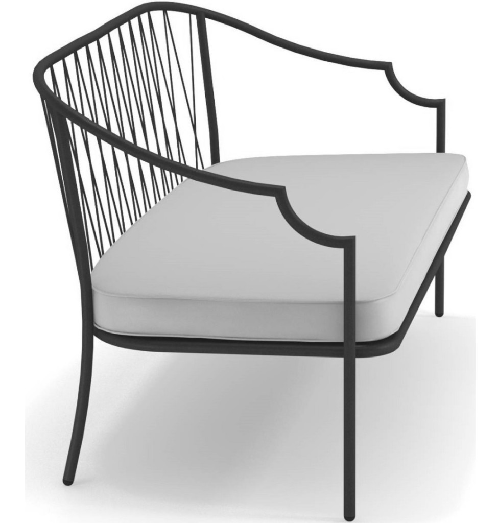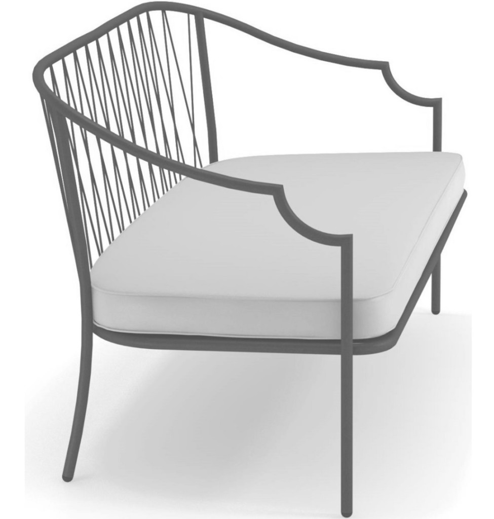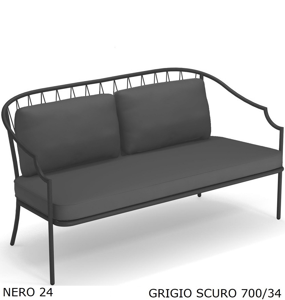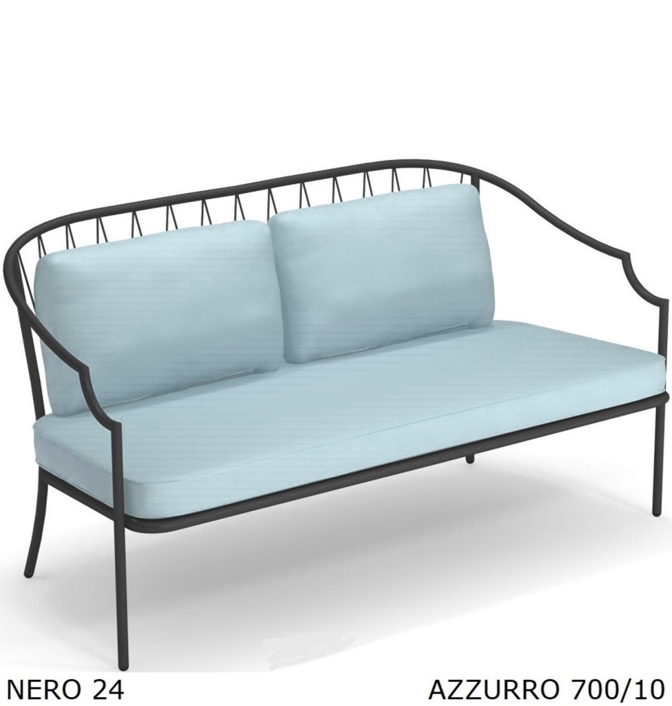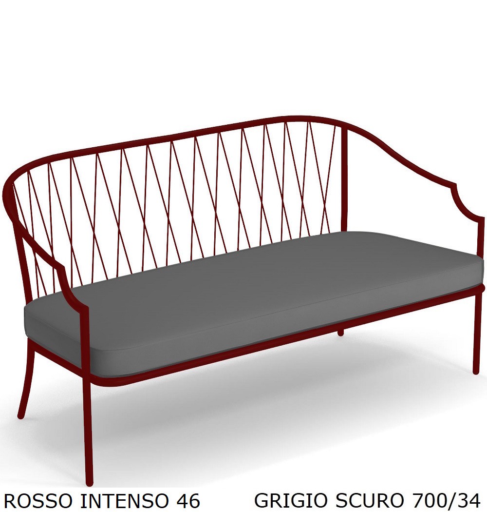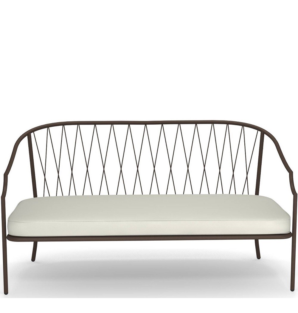 Divano per salotto in acciaio. Seduta in lamiera stirata e schienale in tondino. Struttura in tubolare a sezione rotonda