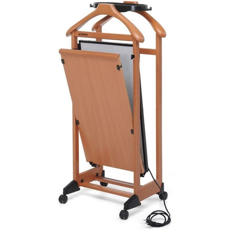 - Dotato di pinze appendigonna regolabili, - Staffe per pantaloni, - Vaschetta porta oggetti con ganci per cinture e cravatte, - Due spalle appendiabiti, - Pannello imbottito per tenere in piega i pantaloni. - Base per scarpe, - 4 ruote piroettanti. - Struttura in legno massiccio di faggio, pannello in truciolare ricoperto, vaschetta in materiale plastico.