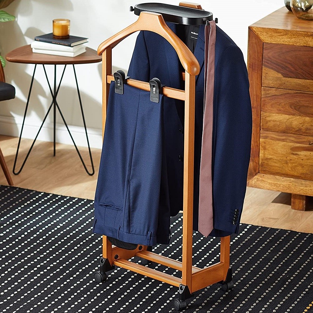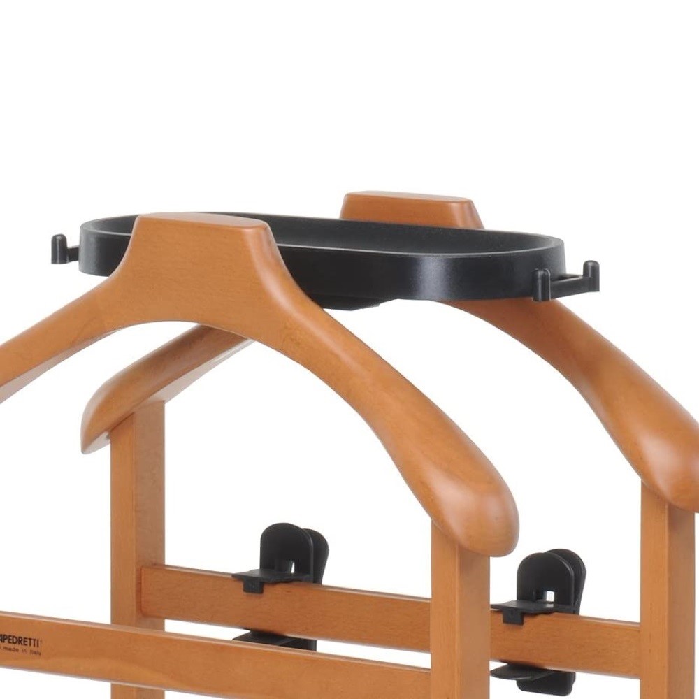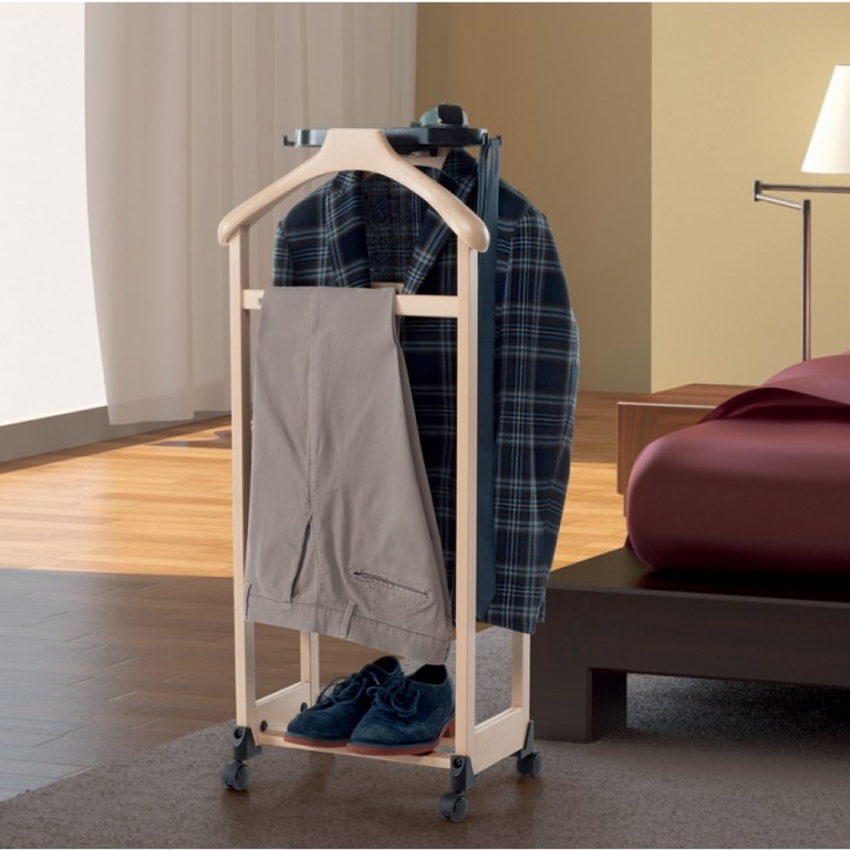 - Dotato di due spalle per giacche e camicie, - Vaschetta portaoggetti con ganci per cinture e cravatte, - Pinze appendigonna regolabili, - Staffe porta,pantaloni. - Base per scarpe, - 4 ruote piroettanti. - Struttura in legno massiccio di faggio, vaschetta in materiale plastico.