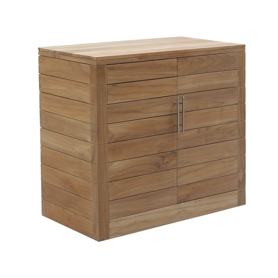 Mobile in teak da esterno con antine e due ripiani regolabili in altezza. Le ante ed il ripiano, come il resto dell’armadietto, sono in legno massello in teak. Questo mobile in teak è adattissimo a riporre oggetti in terrazza oppure in giardino.