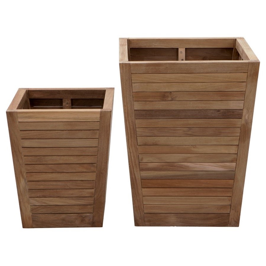Contenitori per vasi in legno da giardino in tre diverse dimensioni, tutti in massello di teak. Perfetti per nascondere vasi di terracotta e per uniformare le piante in giardino. È possibile anche realizzare i contenitori per vasi su misura, su ordinazione.