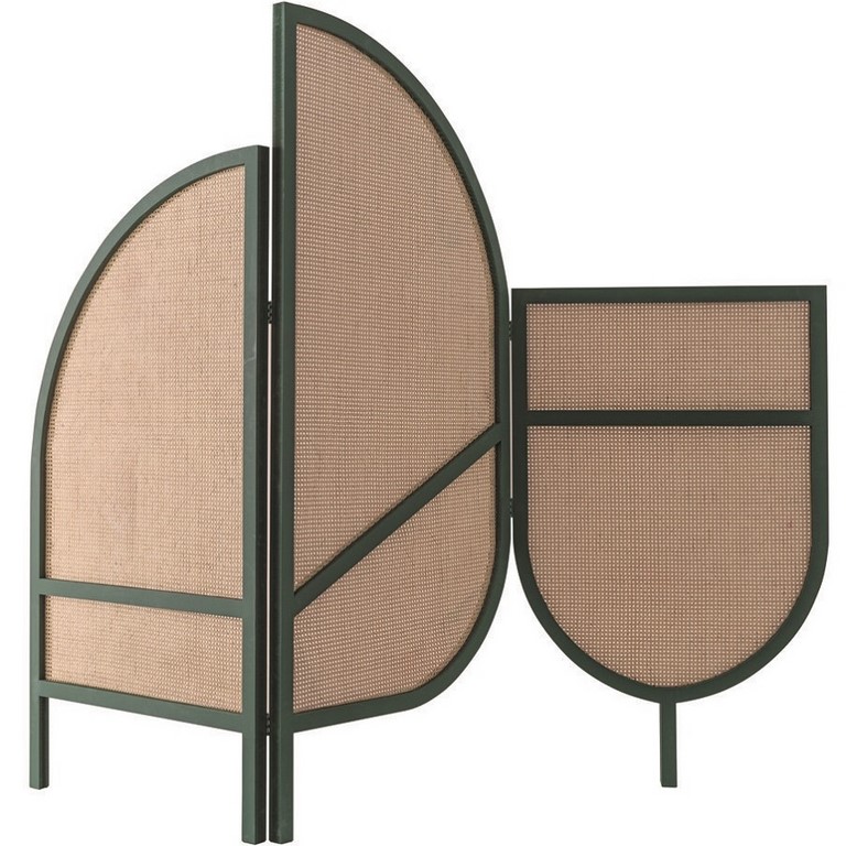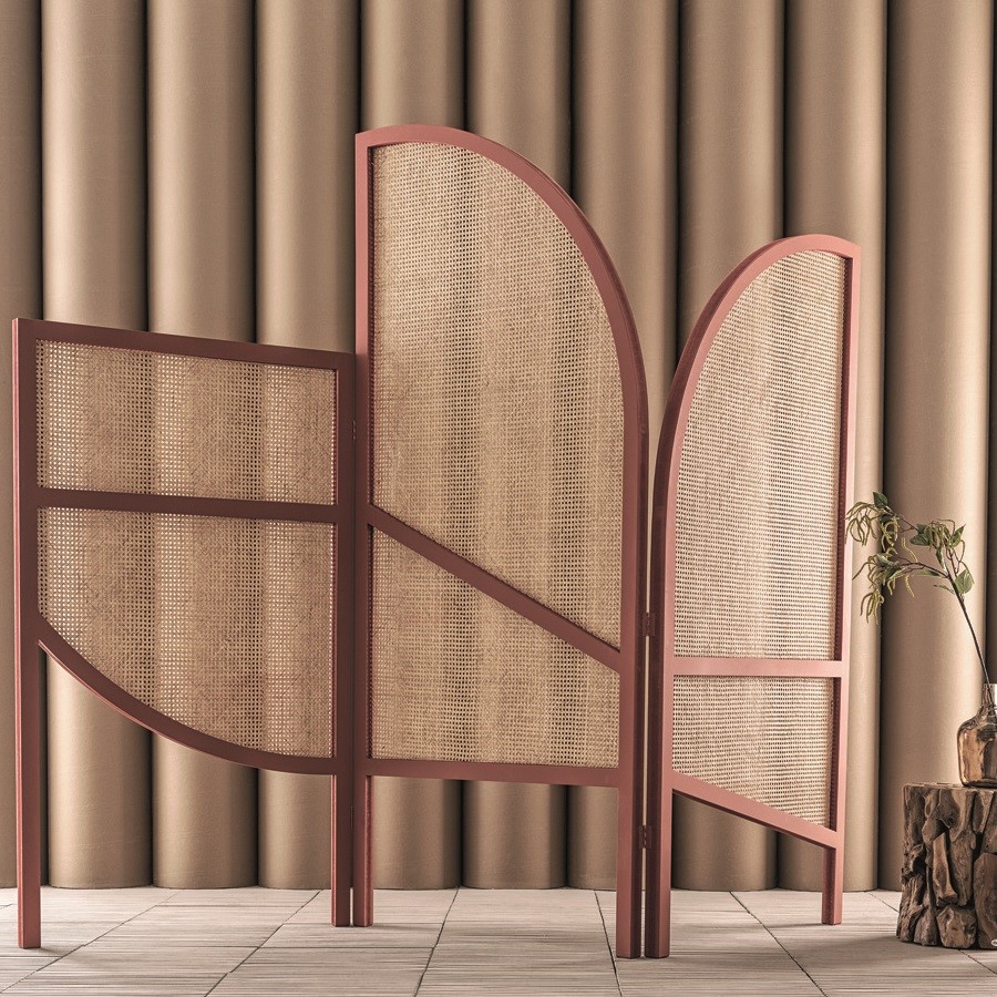 La collezione di paraventi Joys è in legno di teak verniciato e fibra naturale intrecciata con il motivo “paglia di Vienna”. Il design è curvo e tondeggiante: richiama l’idea di archi e porte che proteggono e dividono gli spazi.