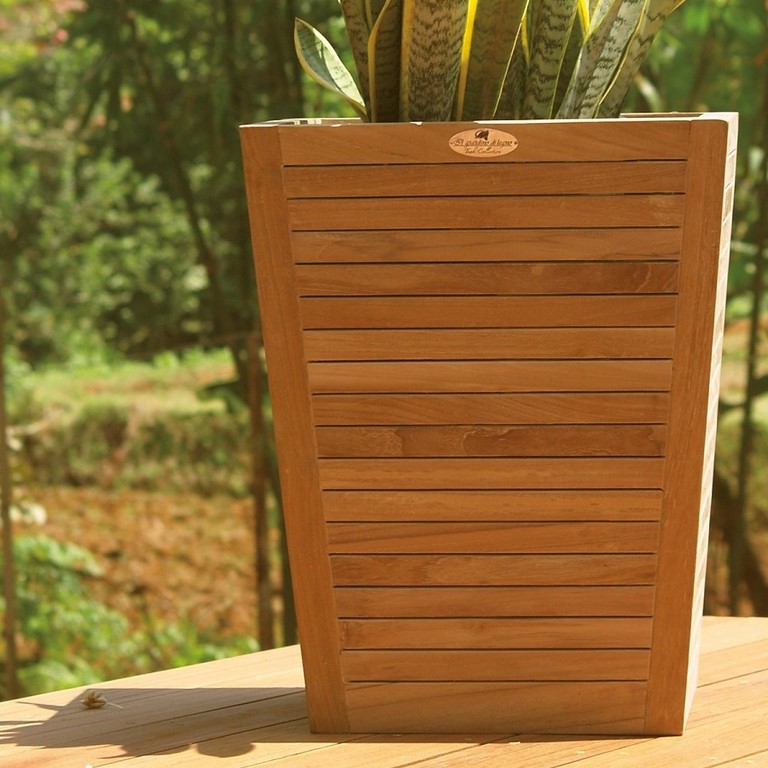 Portavaso in teak da giardino, a tronco di cono di misura media, ideale per piante con una buona fogliatura o fiorite. Un modo elegante di nascondere i vasi di terracotta e di arredare l’esterno con gusto.