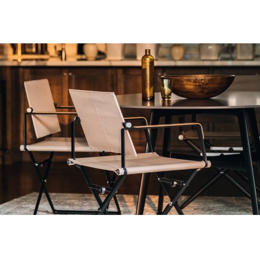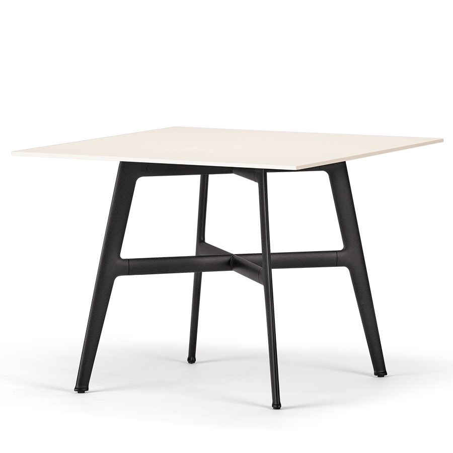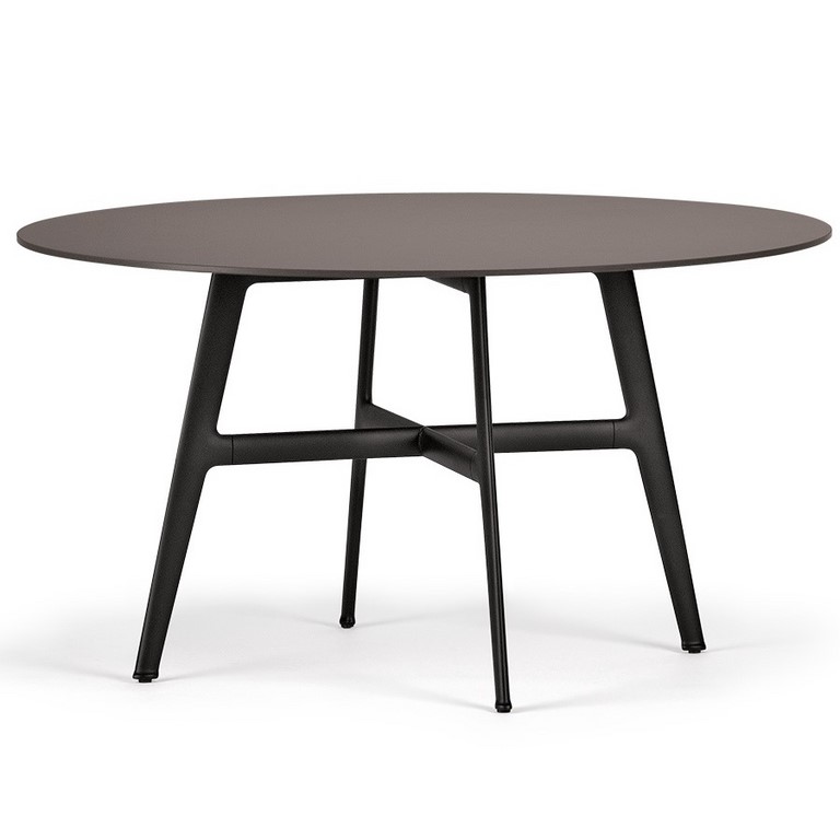 Questo tavolo da pranzo presenta una base in alluminio verniciato a polvere e un innovativo piano in minerale composito due volte più forte del vetro e resistente al gelo, ai graffi e ai raggi UV.