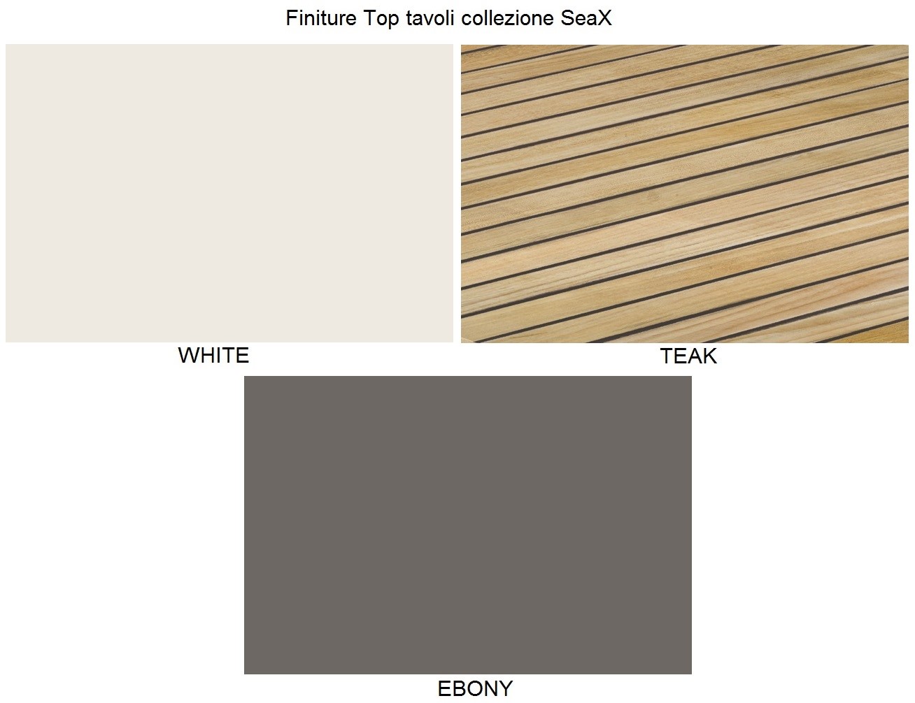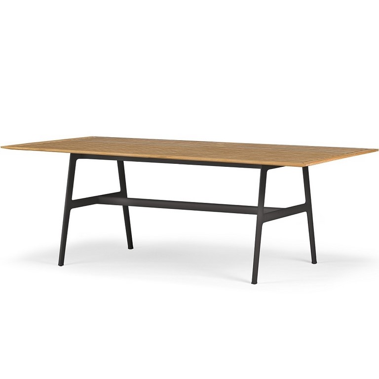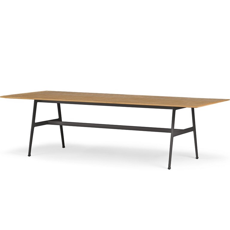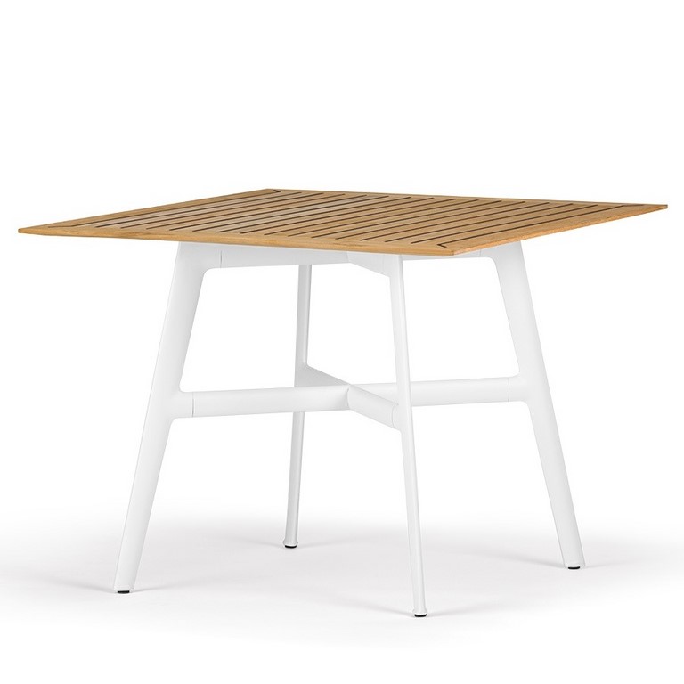 Completano la collezione dei tavoli da pranzo in varie dimensioni e finiture. I telai sono in alluminio verniciato a polvere con gambe in alluminio pressofuso. Il piano in teak è realizzato come i ponti delle barche, in doghe sigillate progettate per espandersi al naturale movimento del legno. Novità assoluta i piani in minerale composito a lastra autoportante, molto robusti e resistenti a gelo, graffi e raggi UV.