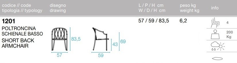 La struttura delle sedute è in tubo di acciaio diametro 22, con spessore 2 mm per un elevato livello di performance outdoor. Alla struttura sono connessi dei tondini di acciaio che costituiscono il motivo decorativo dello schienale: questi tondini sono saldati tramite una tecnologia a proiezione, che permette la fusione dei tondini in maniera tecnicamente più pulita, con un effetto estetico più rifinito e conseguentemente minor rischio di ruggine. La presenza dei sottopiedi in nylon supporta la facilità di spostamento e di protezione delle estremità del prodotto.