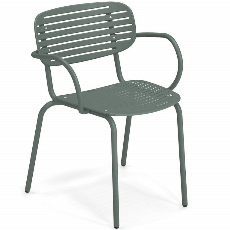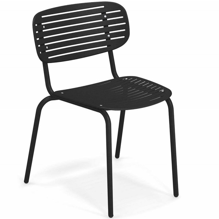 Le linee della collezione Mom ricordano i tradizionali vassoi giapponesi. La struttura è prodotta in tubolare di acciaio Fe360, mentre seduta e schienale, sono caratterizzati dal particolare disegno grafico, sono in lamiera imbutita di acciaio zincato. Finitura Emu-Coat per proteggerla da graffi e ruggine.