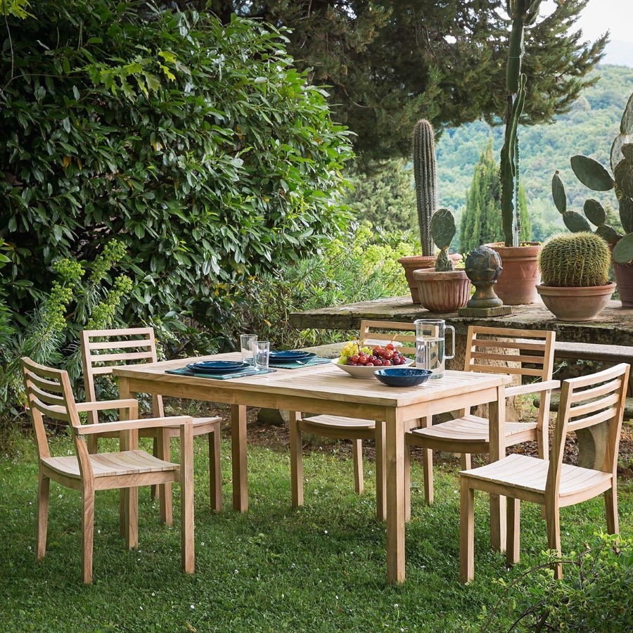 Sedia impilabile da esterno in legno massello di teak. Comoda e robusta è adatta ad ogni ambiente. Il design semplice e lineare si abbina bene ad ogni tavolo e ad ogni contesto. Disponibile anche nella versione con braccioli.