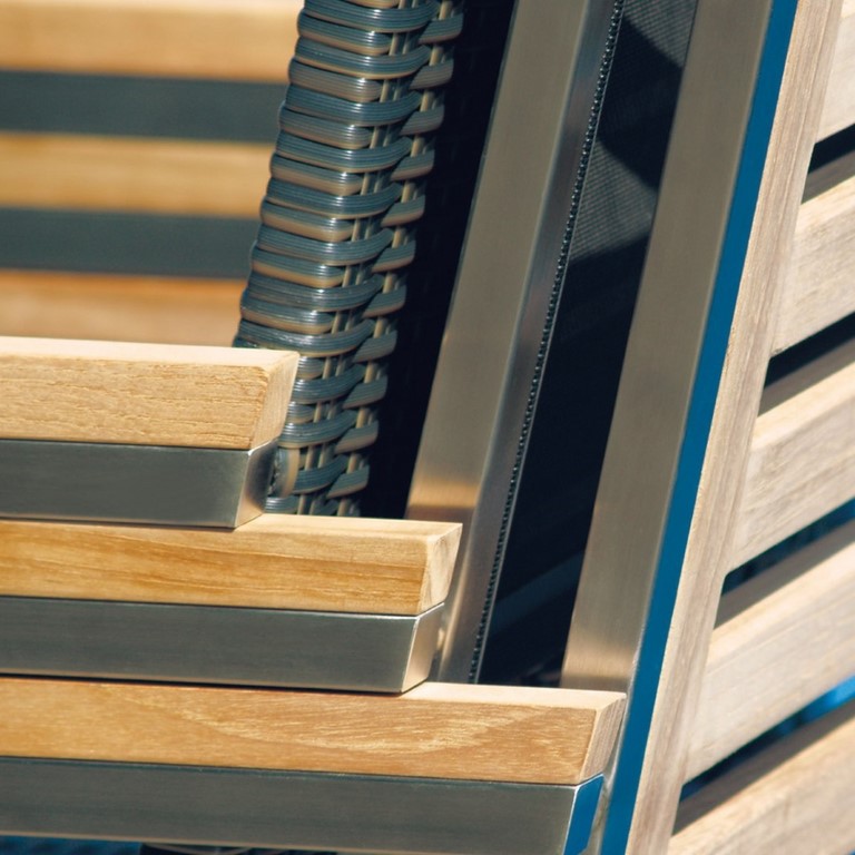 Sedia impilabile in teak e batyline. Lineare, ampia e comoda. L’altezza della seduta la rende adatta ad essere usata come sedia da pranzo mentre il tessuto batyline usato per la seduta e per lo schienale la rende comoda anche come sedia da lettura o da conversazione. Indicata soprattutto per quelle realtà dove si richiede una seduta che possa asciugare rapidamente: ad esempio nei pressi di una piscina.