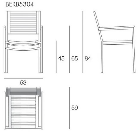Poltroncina con braccioli da pranzo per esterno, impilabile, interamente in teak massiccio. La sua linea è semplice è molto robusta e si adatta a ogni ambiente. Impilabile e leggera, è disponibile anche in versione senza braccioli.
